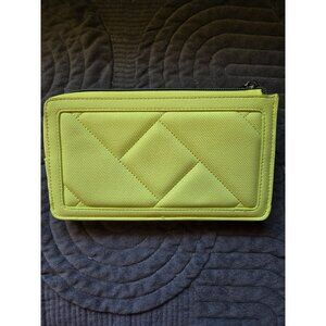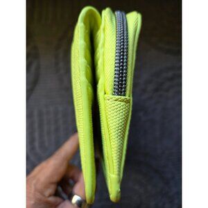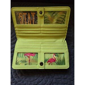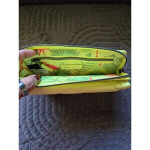 This wallet features a vibrant lime green quilted exterior with a practical zippered compartment. Inside, multiple card slots and clear ID windows are paired with a cheerful tropical flamingo pattern, combining functionality with style. Compact yet spacious, it's ideal for organizing essentials while adding a pop of color to your accessories.