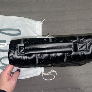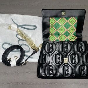 Main compartment with snap lock closure, removable chain metal strap, adjustable/removable crossbody strap, top handle