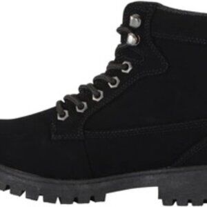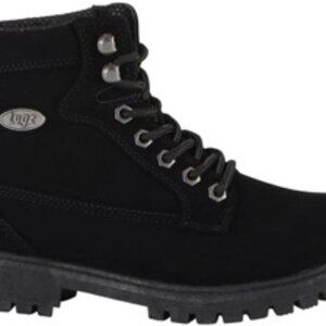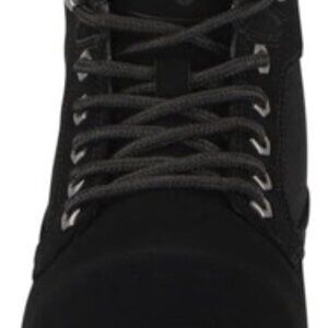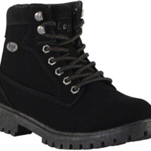 Elevate your shoe game with these stylish Lugz Mantle Hi boots in classic black. Featuring a round toe and lace-up closure, these ankle boots are perfect for both casual and workwear occasions. The low block heel measures between 1-1.9 inches, providing slip-resistant comfort for winter, fall, and spring seasons. Made with nubuck upper material and rubber outsole material, these boots are both durable and fashionable. The Lugz logo accents the shoe, adding a touch of personality to the classic design.