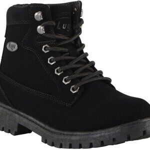 Elevate your shoe game with these stylish Lugz Mantle Hi boots in classic black. Featuring a round toe and lace-up closure, these ankle boots are perfect for both casual and workwear occasions. The low block heel measures between 1-1.9 inches, providing slip-resistant comfort for winter, fall, and spring seasons. Made with nubuck upper material and rubber outsole material, these boots are both durable and fashionable. The Lugz logo accents the shoe, adding a touch of personality to the classic design.