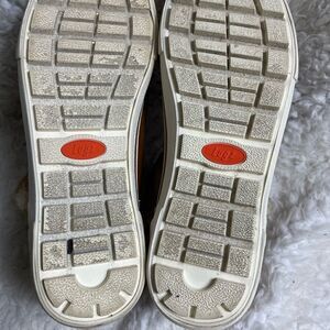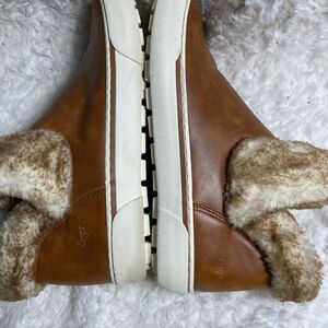Lugz sprig fashion faux leather tan ankle slip on boots faux fur accent Size 11 rubber soles pre owned in good used condition see all pictures any questions please message.