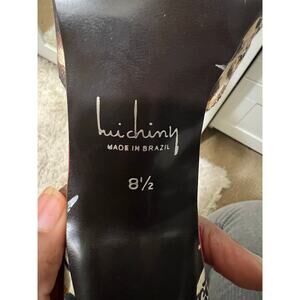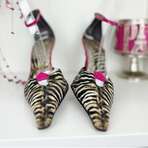 Luichiny Animal Print Pointed Toe Ankle Strap High Stiletto Heels Pumps Size 8.5. Zebra and leopard printed upper in cream, brown and black, with contrasting pink leather trims. Perfect for a night out, adding a striking flair to any cocktail dress or party outfit. Pointed toe. High stiletto heels. Ankle strap with an adjustable buckle closure. Made in Brazil.