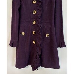 The Luii Anthropologie Purple Ruffle Wool Jacket Coat in size M is a stylish and versatile piece for the fall and winter seasons. PTP 17.5. Made from 100% wool with a knit fabric type, this mid-length jacket features long sleeves and a bohemian theme. The ruffle accents add a unique touch to the solid purple color, making it suitable for a party, casual outing, or business occasion. With a collared neckline, button closure, and pockets, this pea coat offers both comfort and style for the trendy woman.