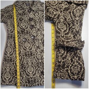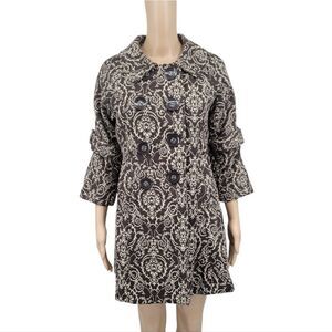 Elegant coat with a striking damask pattern. Features large buttons and a stylish collar. Perfect for a sophisticated look.