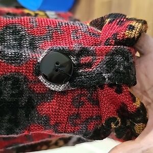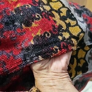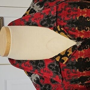 This jacket is great for spring wardrobe. Will go great with black, gray, or tan skirts or slacks. big pockets. very soft fabric. Gathered in the back. Excellent condition and quality. Red, gray, black, and gold.