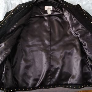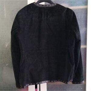 Luis Dell'Olio XL black suede and leather, vintage wearable art, embellished jacket, zipper front, gold studs, gold zipper, lined beautiful Western motif, 47" bust, 27" long.