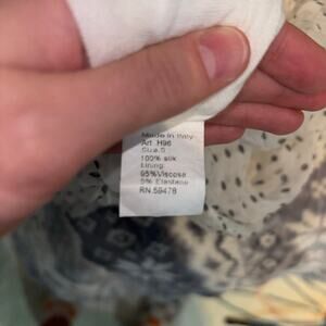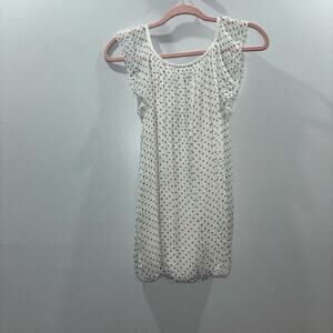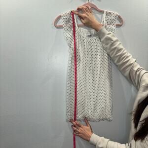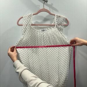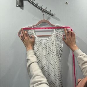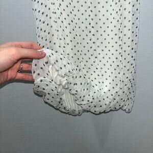 This beautiful blouse is made in Italy and is 100% silk. It is white with black polka dots, double layered, and fully lined. It has a bubble hem and flutter sleeves. This blouse is a size small. You can pair this with a sleek black pant and heel for a clean, professional look. You could also pair this with a cute mini skirt for a date night or night out. There are endless possibilities to style this blouse. You will feel and look luxurious while wearing this blouse!
