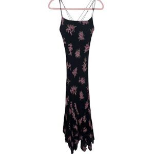 Elegant and rare, this Luisa Spagnoli floral slip dress features a figure-flattering bias cut and dramatic handkerchief hem for beautiful movement. Triple spaghetti straps criss-cross at the back, adding a delicate touch to this timeless silhouette.