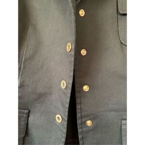 This Luisa Spagnoli blazer is a structured design made from a cotton/elastane blend, offering a tailored yet slightly stretchy fit. The jacket is black with a classic lapel collar and front snap closure featuring metallic snaps. It has multiple pockets with flap closures, including a small chest pocket adorned with signature decorative charms, adding a subtle touch of detail. The back of the blazer is fitted, with seaming that enhances its shape with lightly padded shoulders. The cuffs have matching metallic snaps, maintaining the elegant and polished style throughout the piece.