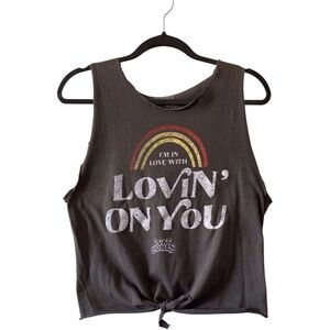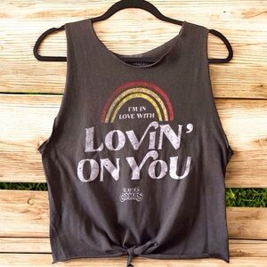 Features the iconic "I'M IN LOVE WITH LOVIN' ON YOU" lyric with a vibrant rainbow graphic, complete with Luke Combs' name. The stylish tie-front detail adds a trendy touch, while the upcycled nature ensures it's a unique statement piece with an authentic, lived-in feel.