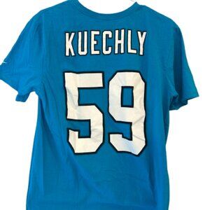 Carolina Panthers t-shirt jersey for Luke Kuechly. Size large. Features his name and number on the back, with Panthers graphics on the front. Number has a "stitched" feel on the back. Soft, breathable material—easy to wear for games or everyday. Gently worn, no major flaws.
