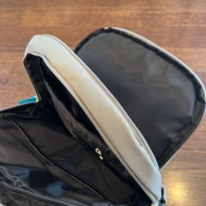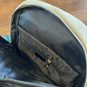 Brand new backpack with gold accents. Brand new and never used. Probably too small for a school backpack but may be good for work. Has a spot for a laptop with zipper pockets and a side panel for a water bottle.