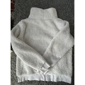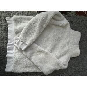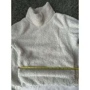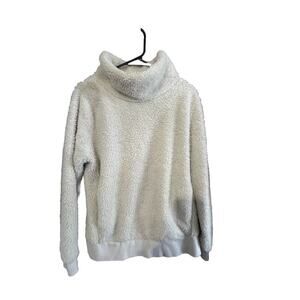 A Lukka Lux Sherpa Fleece Pullover Hoodie in White, size Large. This activewear piece features a Funnel neck, Long Sleeves, and a Solid pattern. The hoodie is made of cozy Fleece fabric with a Polyester lining, suitable for machine washing. The regular fit and pullover style make it a comfortable and stylish choice for women's casual wear.
