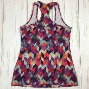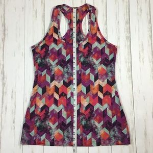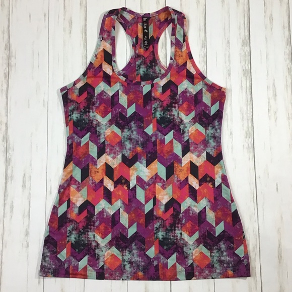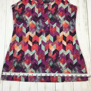 Reposhing this item I purchased from @angelh619. Loved it, but it fit a little larger than I would like. Pretty, vibrant geometric pattern with shades of purple, pink, orange and teal. Inside is white, so not see through at all. It is a thicker polyester with a longer, looser fit. See pics for approximate measurements. I wore it once, so it is still in excellent condition.