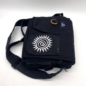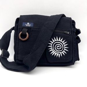 Puzzlestack’s Lukla Black Embroidered Messenger Bag is a compact yet voluminous bag. Along with its multiple pockets used for storage, it includes a large flap closure with velcro. Starting off with the two front pockets, open up the flap to find the main compartment following the large extra pocket, and even a cute mini side pocket! Make travel hands-free with this spacious bag. Express yourself with 5 different hand embroidered with thread designs to choose from! Not only is this bag sustainable and eco-friendly, but made of heavy cotton outside and lined with cotton inside! Available in various hand embroidered designs.