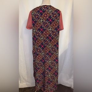 Lula Roe stretchy dark orange dress with multi color orange, gold and ref tones long vet.