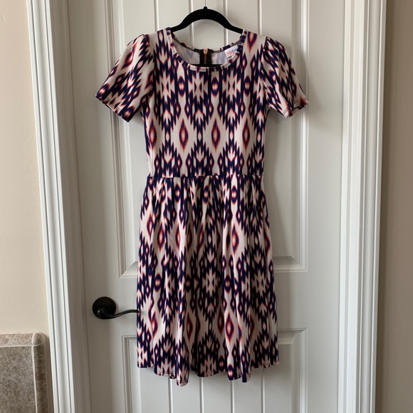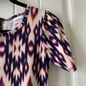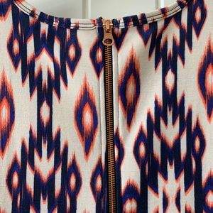 Aztec style design with very vibrant colors. The rose gold zipper on the back is a really nice addition to the fun pattern.