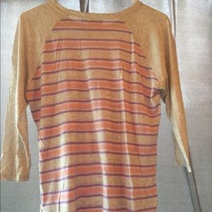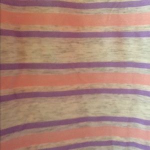 Lula Roe “Randy” style tee is grey 3:4 length sleeves with grey, pink and purple horizontal stripes on body of the shirt. Length of shirt hangs below waist line for extra comfortable fit. Shirt is pre-owned in great condition