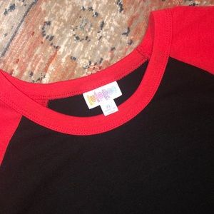 Lula Roe Randy shirt in XL. Red sleeves and black bodice make this a must have for football and basketball games! 3/4 sleeves. Like new. Smoke free pet free home