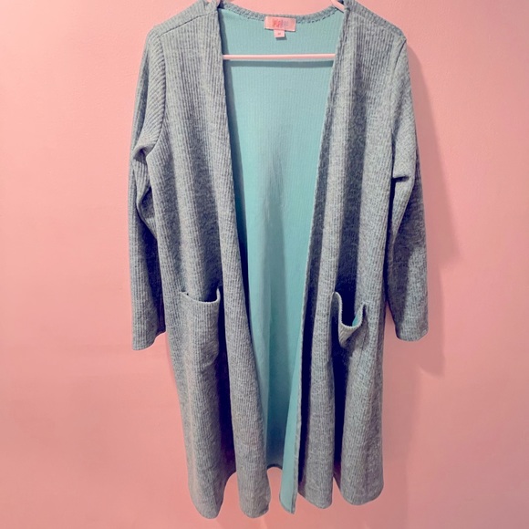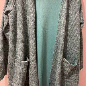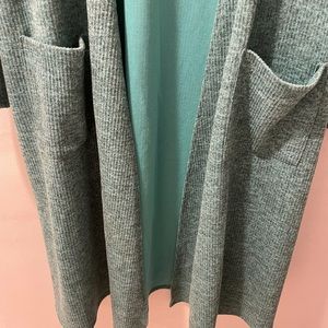 Greenish blue ribbed cotton open cardigan like duster with pockets. Extremely comfortable.