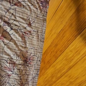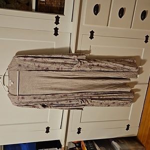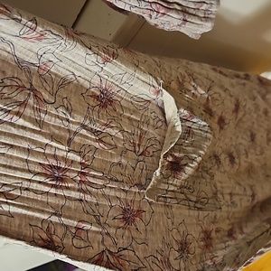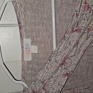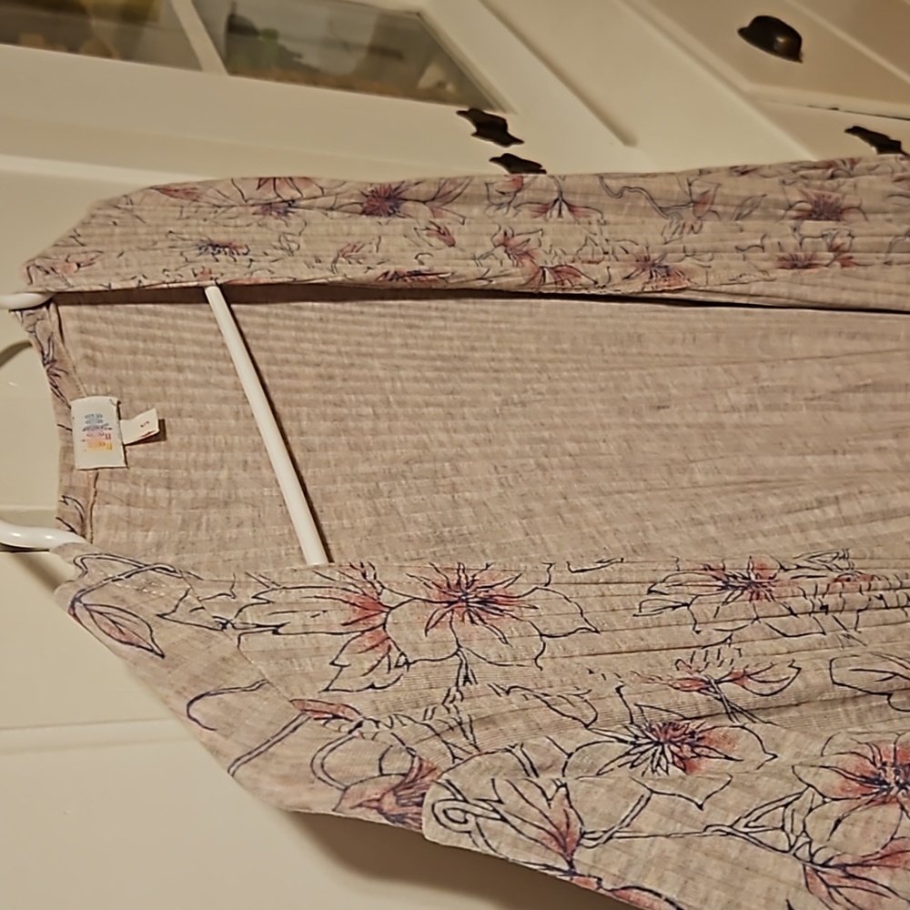 used, light purple cardigan with pink and purple flower details, with embossed lines.