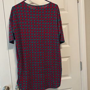 Lula Roe Top. Fabric is sort of stretchy. It’s a turquoise pattern with reddish shade dots. It’s a cute pattern! Lots of life left! Runs big in my opinion