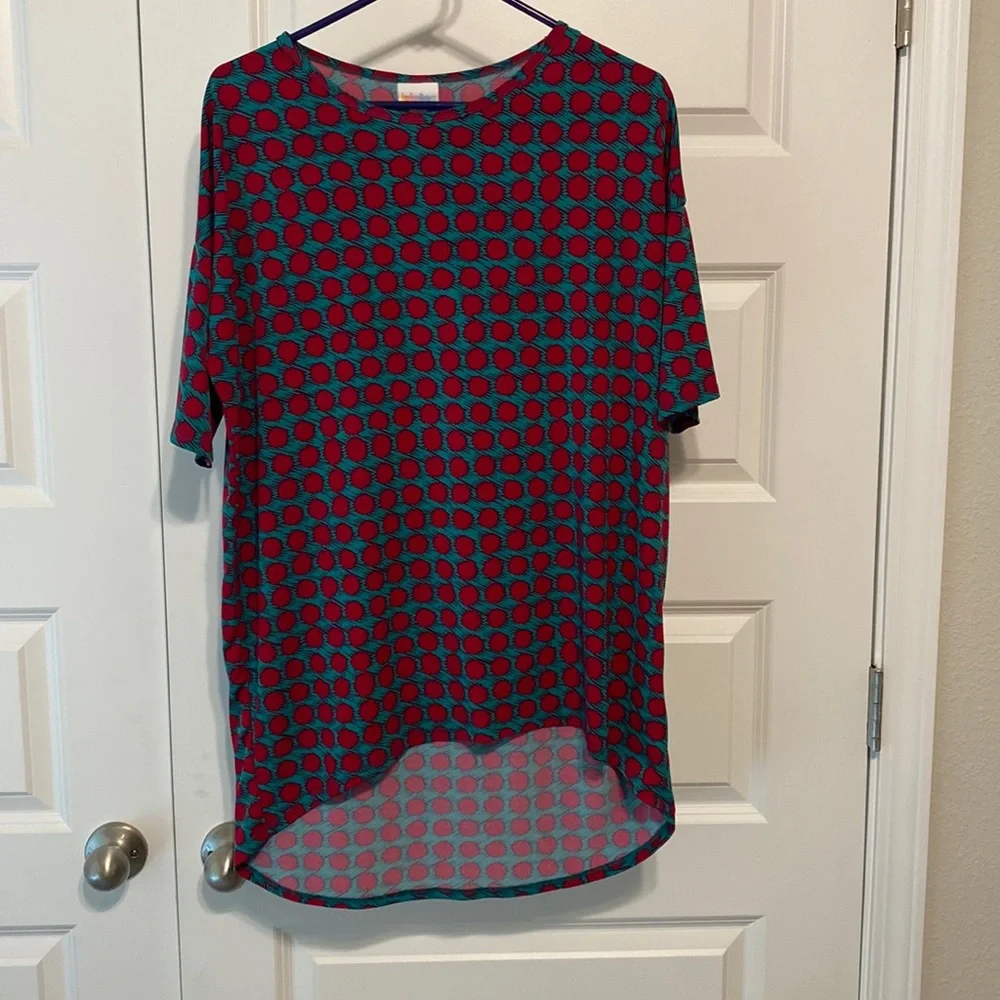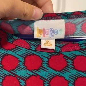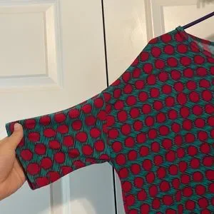 Lula Roe Top. Fabric is sort of stretchy. It’s a turquoise pattern with reddish shade dots. It’s a cute pattern! Lots of life left! Runs big in my opinion