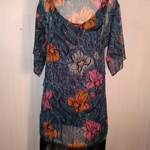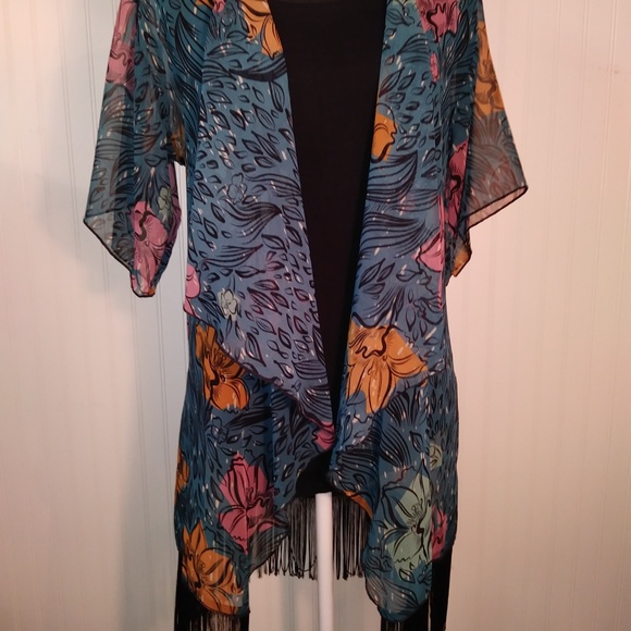 Beautiful Lula Roe sheer, fringed kimono. Beautiful blue and black with yellow and pink throughout. Sorry about lousy photos, will try to post new ones soon. NWOT. No flaws.