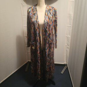 Lula Roe size S (fits like medium), long sleeves and it has pockets. This maxi length duster, beautiful over jumpsuit, dress, etc. Color palette is fall colors. The duster is made of 96% polyester and 4% spandex.