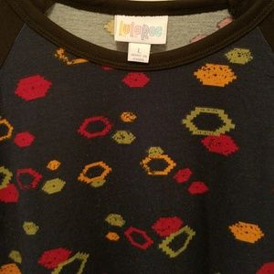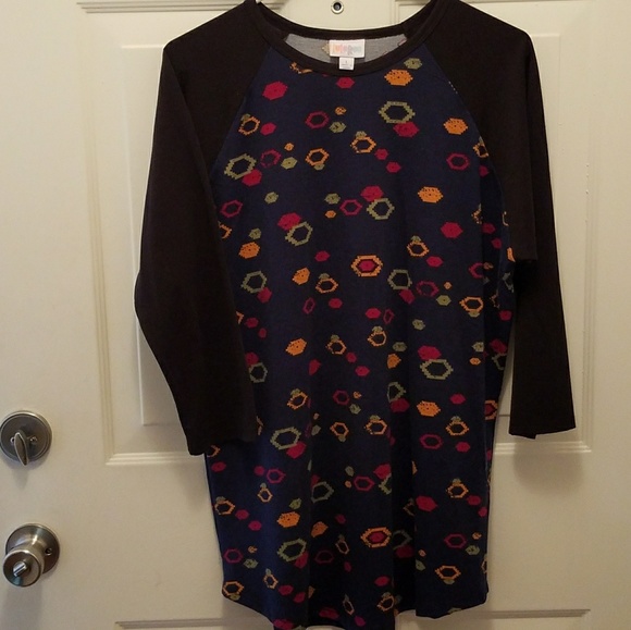 Large lularoe quarter length sleeve Randy w black sleeves and a midnight blue background with multiple color print 100% cotton super comfort I am 5.foot 5 and this style Randy lays at my waist.