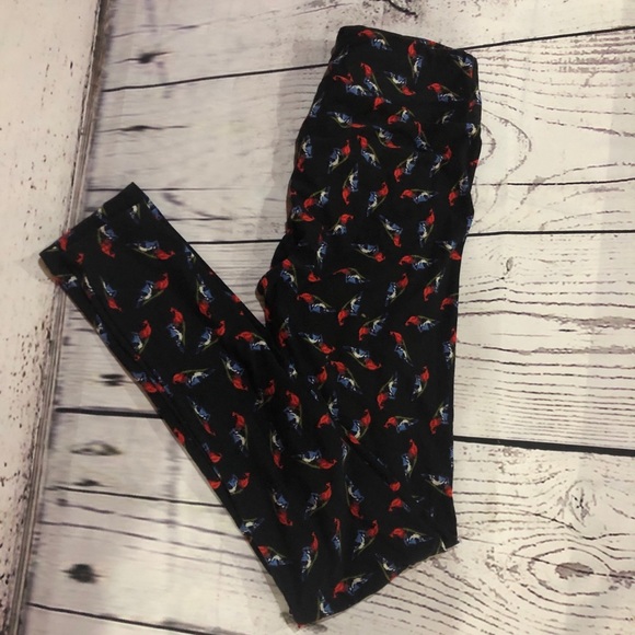LulaRoe leggings. Soft and cozy. One Size best fits size 2 - 8. Lots of stretch. Black with blue and red pattern print.
