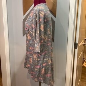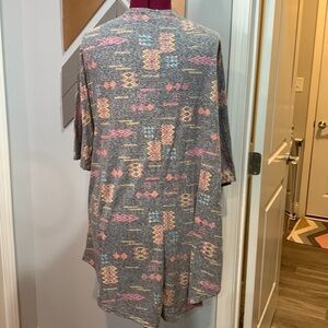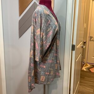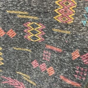 In excellent used condition. Lightweight fabric. The main color is grayish black. Features a colorful Aztec print throughout. Open facing and sleeves that go past the elbow. size small.