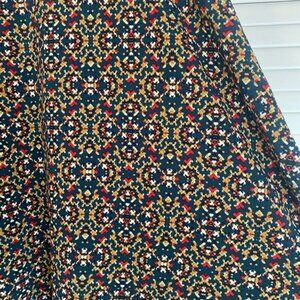 Designed with a professional edge, this LulaRoe Azure swing skirt features a geometric print in bold teal, red, copper, and cream tones.