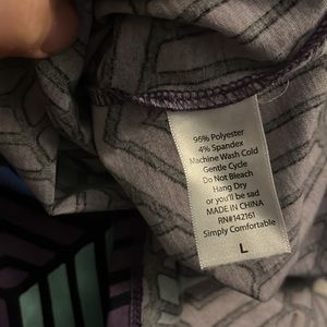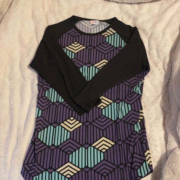 Geometric purple, black, white and light blue designs. 3/4 sleeve (fits snug)