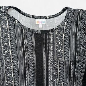 LulaRoe “Carly” Black and grey paisley striped high low midi dress with short sleeves in SIZE WOMENS XS (2-4). Soft, flowy material and very comfy!