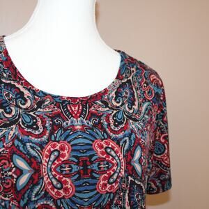 LulaRoe Carly Dress, size S, Paisley Burgundy, Tan & Blue hi-lo hem