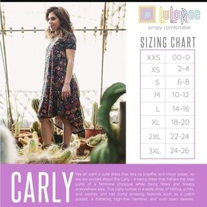 The LuLaRoe CARLY swing dress that flatters the feminine physique; featuring a patch pocket, a flattering high-low hemline, and cool open sleeve. Great by itself or pairs fabulously with leggings. LuLaRoe Carly Swing Dress Sizing: XX-Small XXS fits 00-0; X-Small XS fits 2-4; Small S fits 6-8; Medium M fits 10-12; Large L 14-16; X-Large XL fits 18-20; XX-Large 2XL fits 24-24; XXX-Large 3XL fits 26-28.