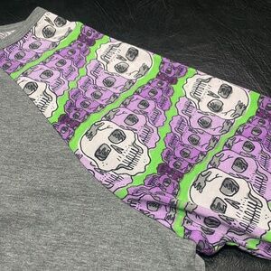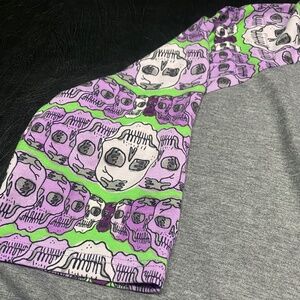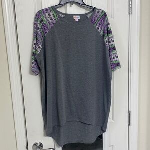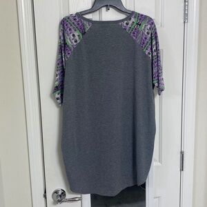 LulaRoe Irma Top - S. Fits sizes 6-8 but can fit up to a 12. Gently Used - Like New. Smoke Free Home. This is a loose high-low tunic with fitted mid length sleeves. the extra length in the back makes it a great compliment to leggings. Color: Gray with Green stripes, purple and white skulls. Great for Halloween ๐๐