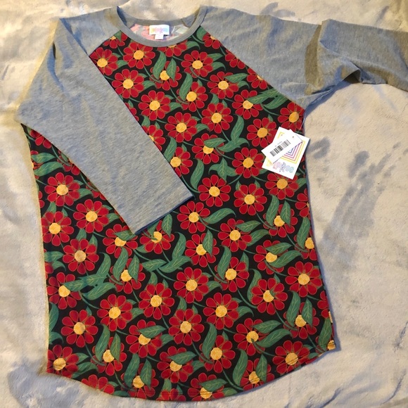 3/4 sleeve, crew neck shirt baseball style tee. Red, green & yellow floral pattern with solid gray sleeves. Size M(10-12).