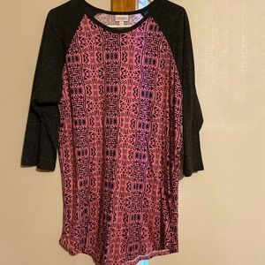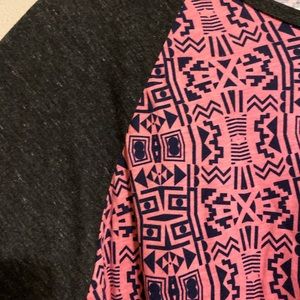 LulaRoe Randy pink background with black Aztec designs. Dark grey heathered sleeve
