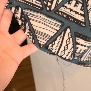 Geometric pattern with dark teal green background, dark gray sleeves. A part of the hem has come undone.