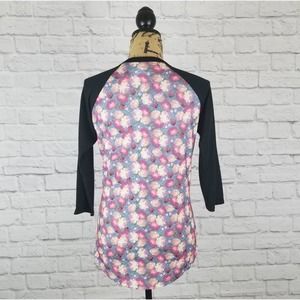 LulaRoe Randy baseball-style floral fabric with black raglan sleeve top