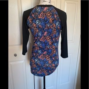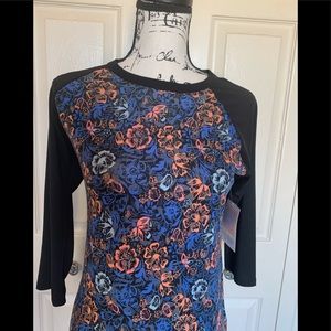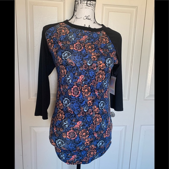 NWT-LulaRoe Randy baseball t-shirt. It is a size XXS but LulaRoe clothes run large for size. It has black 3/4 length sleeves and a floral body. The tshirt has a black background with coral, baby blue, and royal blue flowers. The t-shirt measures 17” from armpit to armpit and 27” in length. These baseball T-shirts are super comfortable.