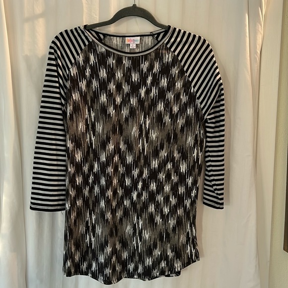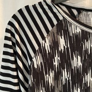 Black and white striped sleeves with black, grey abdomen white mixed body of top.