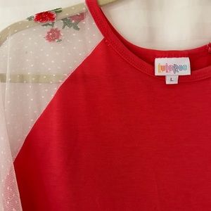 LulaRoe Randy Top with three quarter dolman sleeves. Sleeves are clear lace with red flowers and green stems.