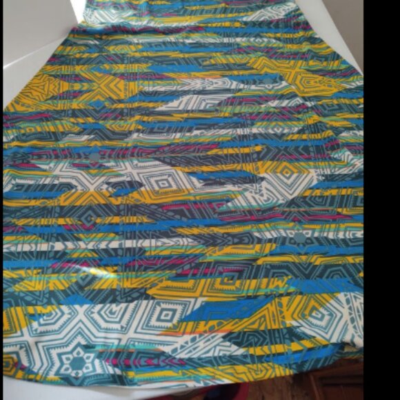 The LulaRoe skirt in Azure size XL features a geometric pattern in blue and yellow colors.