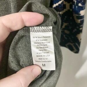 LulaRoe brand. Women's medium. Randy baseball style crew neck top. Gray with blue and pink geometric print 3/4 sleeves. Very soft. Bottom is curved in a flattering cut. In preloved condition, pilling present (see photos for condition); as with any preowned clothes, you should wash before wearing the first time. Made of 96% spun polyester, 4% spandex. From a pet friendly home.