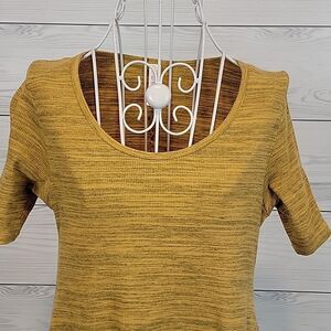 Perfect for leggings or your favorite jeans casual top by LulaRoe with a fit and flare hemline, fitted half sleeves, and a pretty marled mustard yellow. Great pre-owned condition.