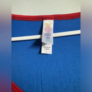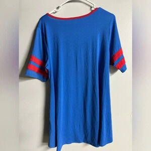 Great used condition. No stains rips or tears. Blue long tunic shirt with red strips on sleeves. Reminds me of wonder women. Great to wear with leggings.