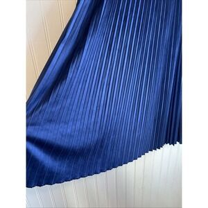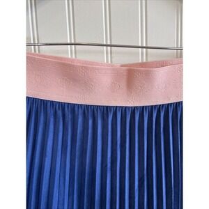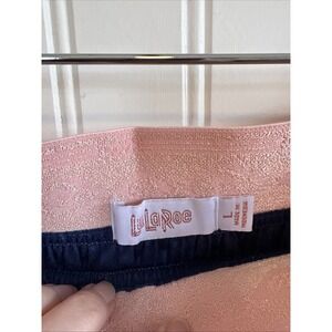 The LulaRoe women's size large pleated blue skirt features an elastic waist for a comfortable fit. Made of a velvet-like fabric, this knee-length skirt is perfect for adding a touch of luxury to any outfit. The pleated style adds a playful and feminine touch to the design, making it a versatile piece for any wardrobe.